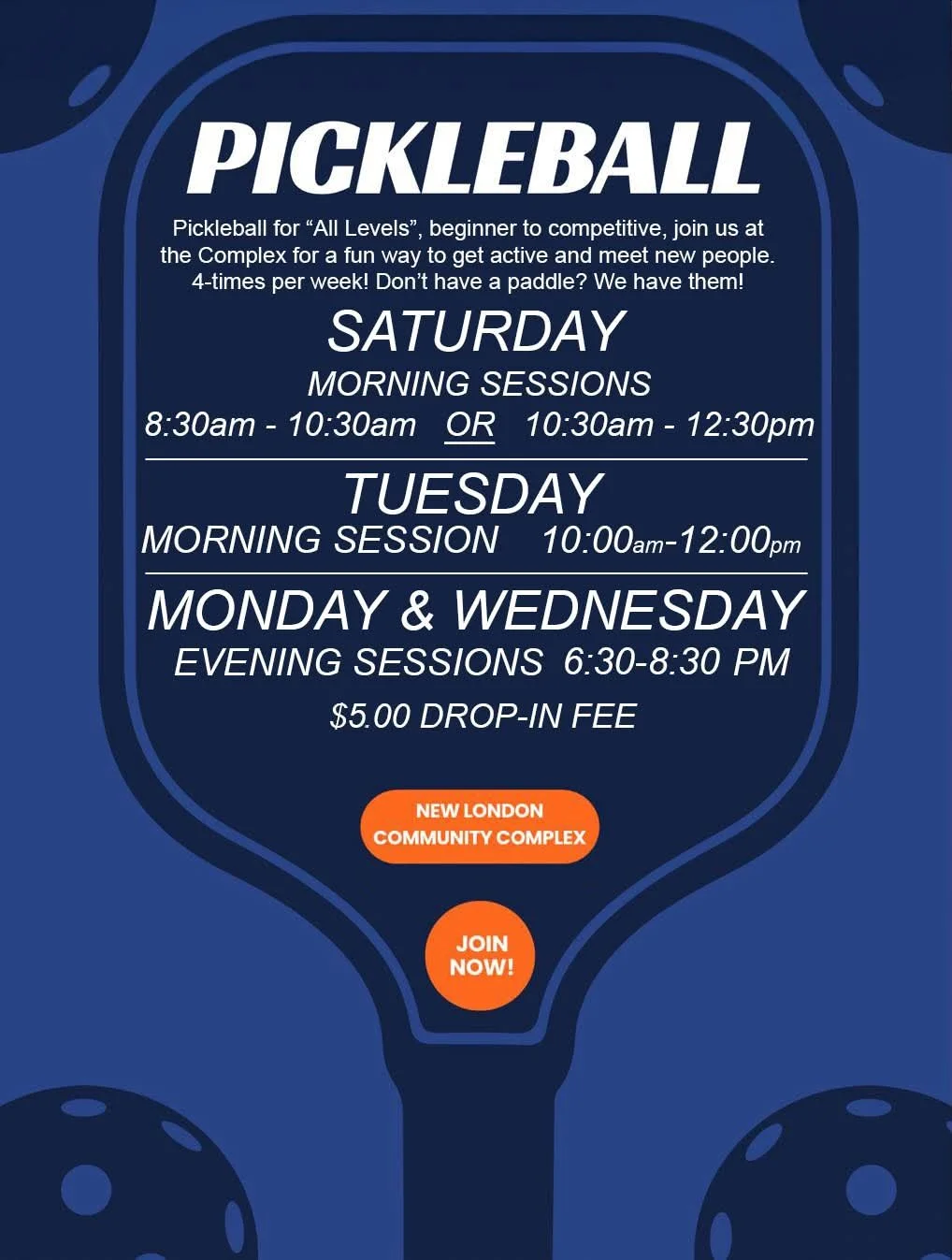 Come and join us for some indoor Pickleball and experience why it is one of the fastest-growing sports! We offer a welcoming, fun space for all ages and skill levels. We love introducing new players to the sport. Come out and play with your friends and neighbours, it's a fun way to get active. Don't have a racket? No problem, we have you covered! Just bring your sneakers and get ready to be hooked.